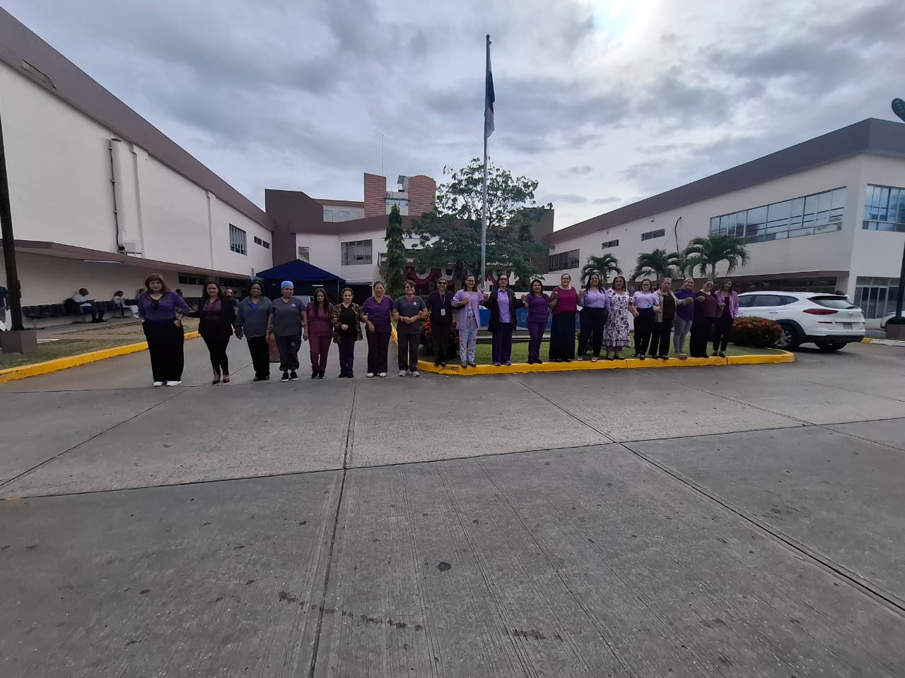 - En el Hospital Irma de Lourdes Tzanetatos, colaboradoras vestidas de morado participaron en la cadena humana bajo el lema “No calles, actúa, denuncia”.