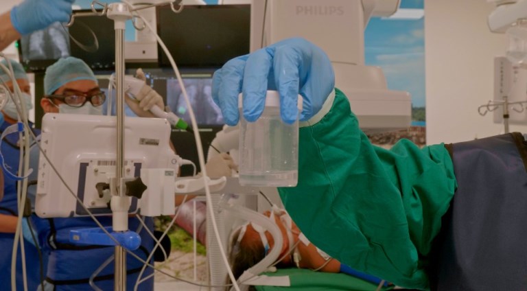 Durante el procedimiento, la Unidad de Neumología Intervencionista ejecuta además la criobiopsia, una técnica que consiste en la congelación del tejido pulmonar, lo que permite obtener muestras de mayor tamaño y mejor calidad diagnóstica. Esta combinación tecnológica posibilita realizar biopsias de manera mínimamente invasiva, evitando en muchos casos cirugías abiertas y hospitalizaciones prolongadas.